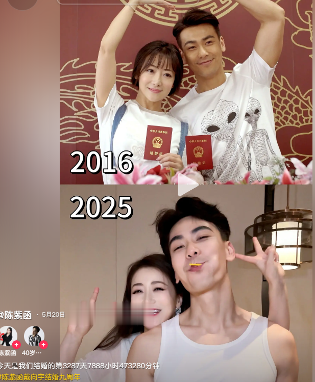 前段时间,陈紫函和戴向宇还在抖音发布视频,庆祝结婚九周年纪念日。