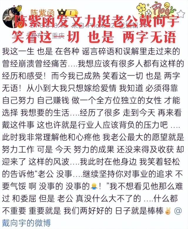 当时陈紫函还发文力挺戴向宇,并表示让戴向宇坚持自己的事业不要放弃。