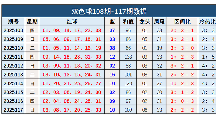 双色球第2025117开奖奖号:红球06、08、17、20、25、33,蓝球10。和值109,龙头06,凤尾33,区间比2:2:2,冷热比3:3。蓝球开出大数号码10。