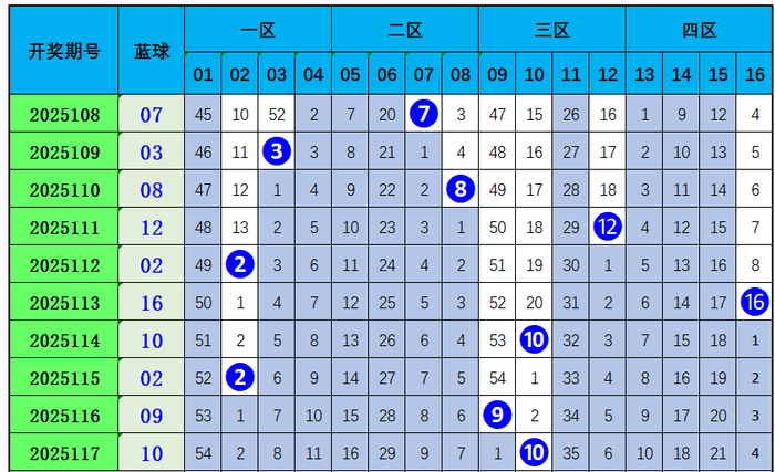 上期开出蓝球号码10,近10期,一区开出3次,二区开出2次,三区开出4次,四区开出1次,总体走势:三区表现较热,本期看好蓝球号码:06。